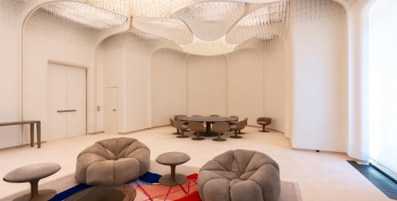 تزئینات چشمگیر اتاق به سال ۱۸۶۱ برمیگردد، زمانی که برای «اُژنی»، همسر ناپلئون سوم، طراحی شد. هنوز هم بالای درها میتوان حروف درهمتنیده «NE» را دید؛ یادگاری از امپراتور و همسرش. اما این فضا فقط به گذشته محدود نشده؛ در کنار طلاییهای پرشکوه قرن نوزدهم، ردپای طراحی مدرن هم دیده میشود. میزی از «تیری لمِر» و تابلویی تاریک از «پیر سولاج» نیز تضادی زیبا با نور و درخشش اتاق ایجاد کردهاند.